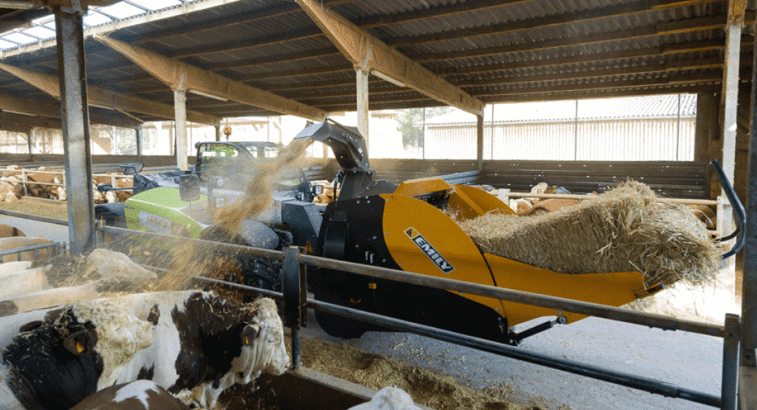 A complete range for bedding : mounted straw blower with turbine, trailed bale spreader, bedding bucket, self propelled bedding barn machinery.